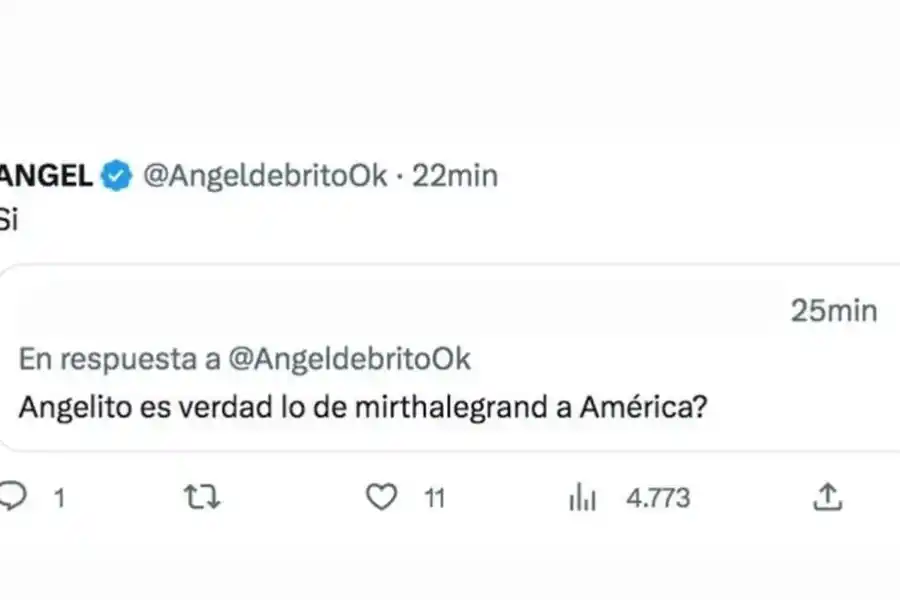 Ángel de Brito republicó el tweet de Piaggio y recibió esta pregunta de un seguidor: "¿Angelito es verdad lo de Mirtha Legrand a América?", y no dudó en confirmar la información de su colega, pero sin dar ningún detalle: "Sí".