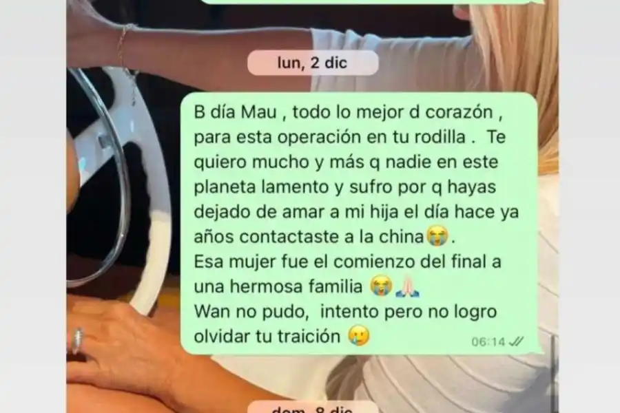 En varios de los mensajes hay referencias a la operación de rodillas que tuvo Icardi, por la terrible lesión que sufrió hace algunas semanas. “Todo lo mejor de corazón para esta operación en tu rodilla. Te quiero mucho y más que nadie en este planeta lamento y sufro porque hayas dejado de amar a mi hija el día, hace ya años, que contactaste a la China”, lanzó Colosimo, en referencia al affaire que tuvo el delantero con la actriz.