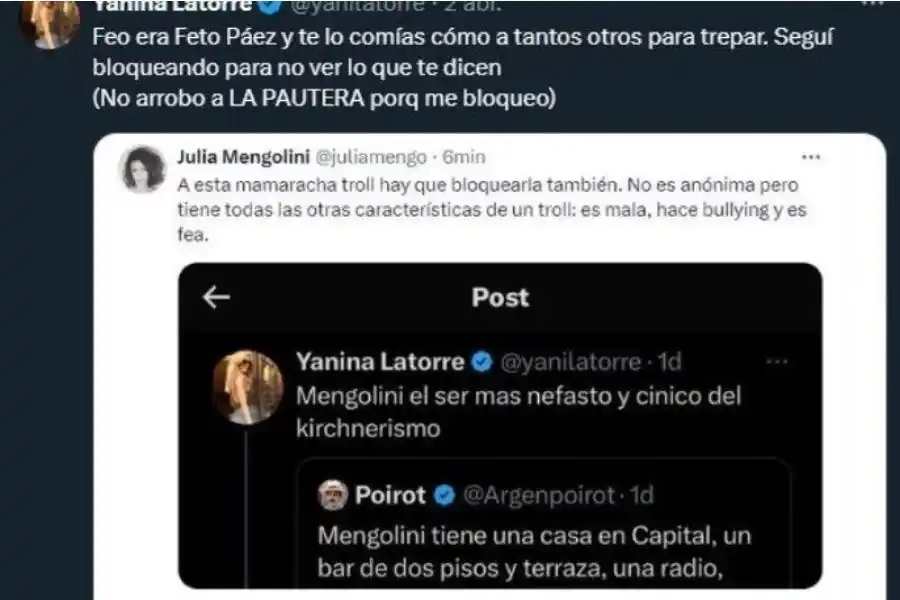 Yanina no esquivó el menesaje y le respondió: "Feo era Feto Páez y te lo comías como a tantos otros para trepar. Seguí bloqueando para no ver lo que te dicen (no arrobo a la pautera porque me bloqueó)".
