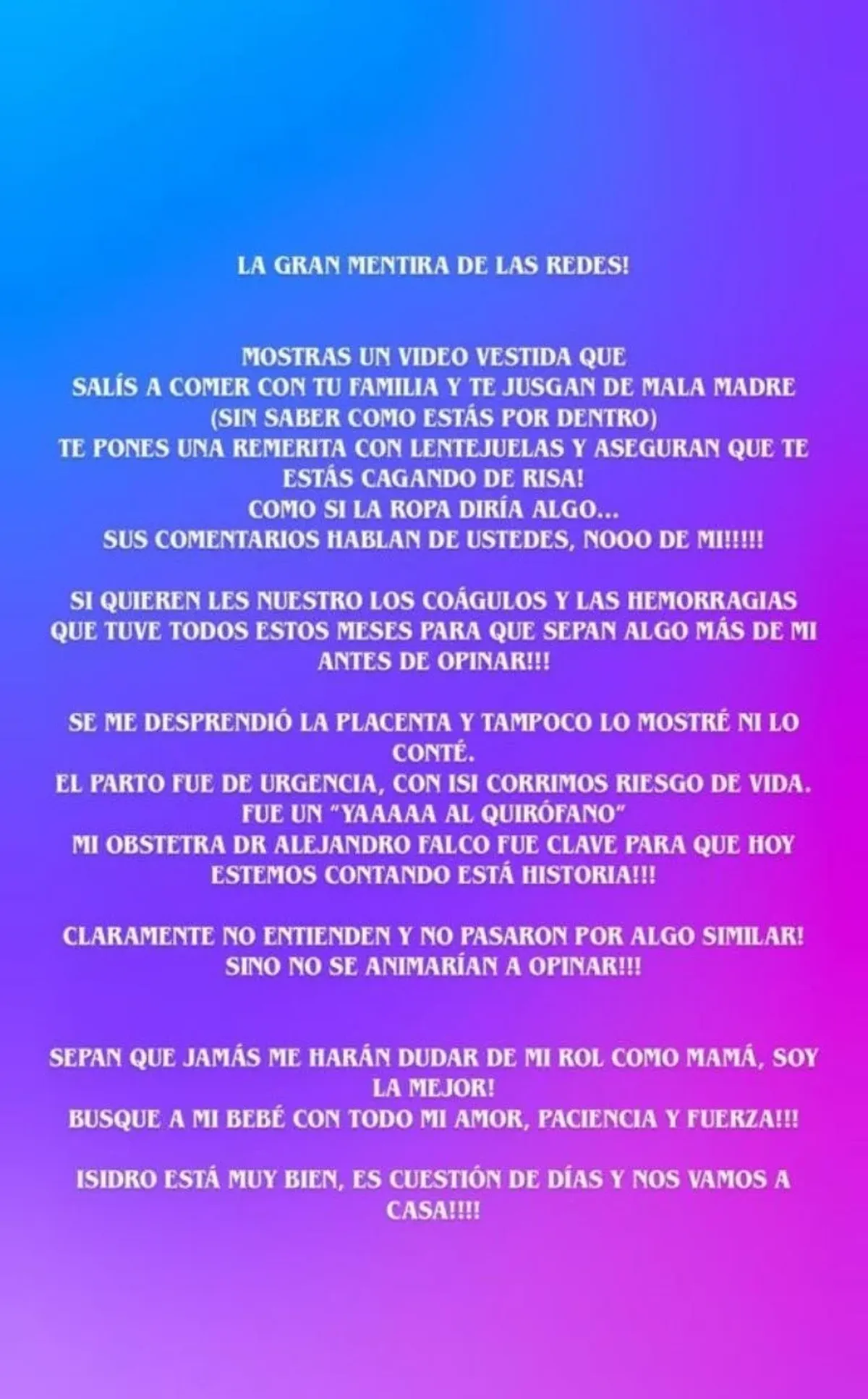 El posteo generó una inmediata ola de mensajes de apoyo y cariño por parte de sus seguidores, que siguieron de cerca cada actualización desde el nacimiento de Isidro, ocurrido el 3 de diciembre, en un contexto delicado y con intervención médica de urgencia.