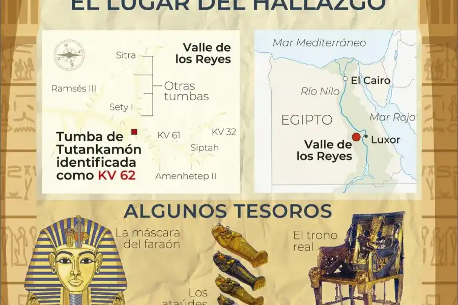 El descubrimiento de la tumba del faraón egipcio Tutankamón y sus tesoros cumplirá este viernes 100 años y constituyó un hito en la "egiptomanía" y en el estudio científico de la civilización del Antiguo Egipto, con una gran cobertura mediática que fogoneó el misterio de "La maldición de la momia", sobre la cual hasta se hicieron pruebas de ADN.