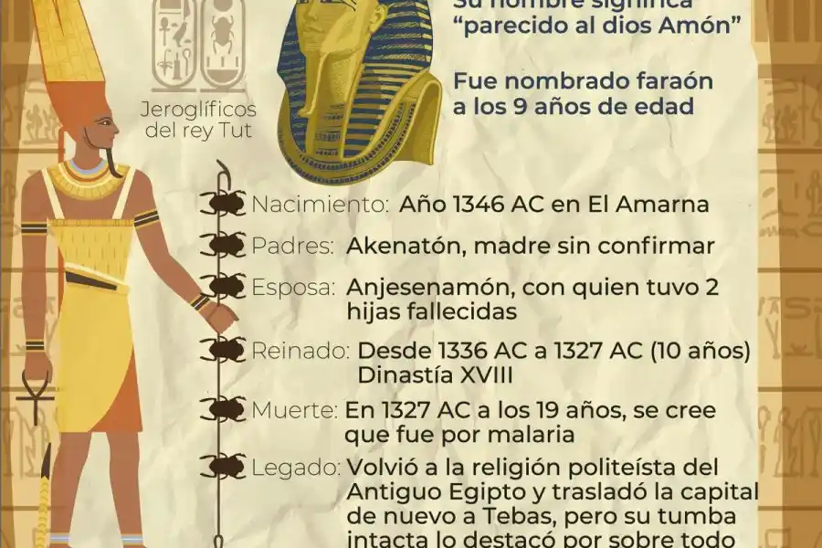 Sobre TutankamónTutankamón llegó al trono a los 9 años durante el período de la Dinastía XVIII y tuvo un reinado "muy corto", de diez años (1336-1327 a.C.) hasta su muerte a los 19, recordó en diálogo con Télam la investigadora del Conicet y fundadora del Centro de Estudios de Historia del Antiguo Oriente en la Universidad Católica Argentina, Roxana Flammini, quien adhiere a la grafía Tutankhamón mientras que la Fundéu RAE dice que es preferible escribirlo sin hache.