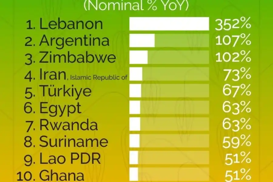 La Argentina ocupa el segundo lugar en el ranking de los países con mayor inflación de alimentos en el mundo, ubicada detrás del Libano y por encima de Zimbabwe, según un informe elaborado por el Banco Mundial. El ranking lo completan Irán, Turquía y países africanos como Ruanda y Ghana.