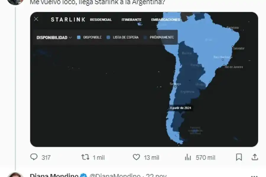 "Estamos en eso", le dijo Diana Mondino a un usuario de la red social X, cuando le consultó si era verdad que los satélites Starlink, de la empresa SpaceX de Elon Musk, le darán Internet a la Argentina en el 2024. Mondino es la canciller designada por Javier Milei para su gobierno.