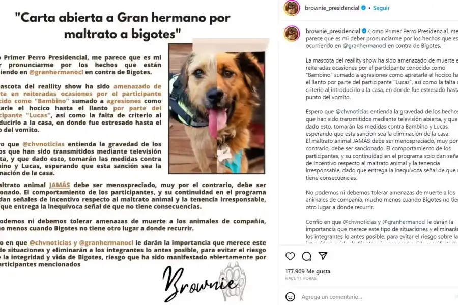 Al ver un video donde maltrataban al perrito, los fanáticos pidieron la expulsión de Lucas Crespo y hasta emitieron un comunicado “firmado” por Brownie, la mascota del presidente chileno, Gabriel Boric.
