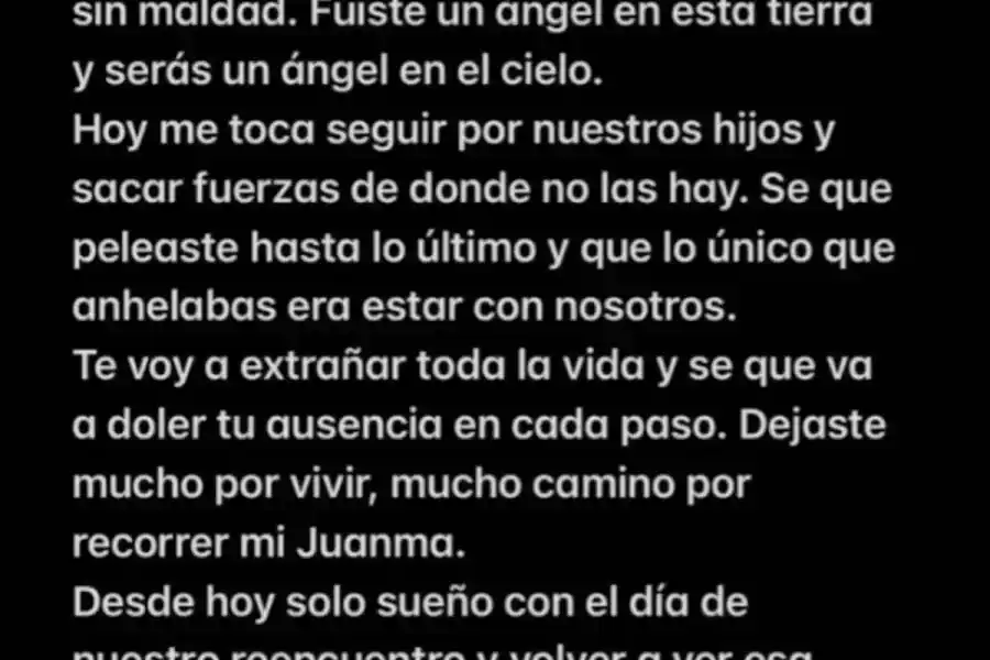 Después, expresó: “Hoy me toca seguir por nuestros hijos y sacar fuerzas de donde no las hay. Sé que peleaste hasta lo último y que lo único que anhelabas era estar con nosotros. Te voy a extrañar toda la vida y sé que va a doler tu ausencia en cada paso. Dejaste mucho por vivir, mucho camino por recorrer mi Juanma. Desde hoy solo sueño con el día de nuestro reencuentro y volver a ver esa sonrisa que me llena el alma. Gracias a todos los que pensaron en él e hicieron fuerza de una forma u otra. Hoy Juanma nos cuida a mí y en especial a nuestros bebés desde el cielo. Te voy a amar toda mi vida mi guerrero. Esta vez tocó perder”