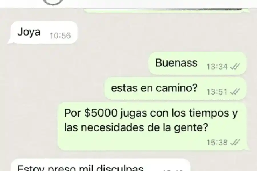 “¿Por 5 mil pesos jugás con los tiempos y la necesidad de la gente?”, le volvió a mandar la muchacha casi 2 horas más tarde, probablemente con la idea de que no iba a recibir ninguna respuesta por parte de ese número.