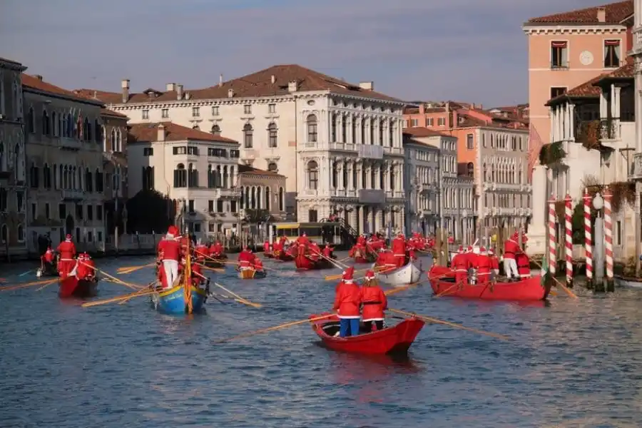 Con sus clásicos trajes rojos y barbas blancas, los participantes desfilaron en embarcaciones típicas venecianas conocidas como "mascarete", decoradas con luces y adornos festivos.