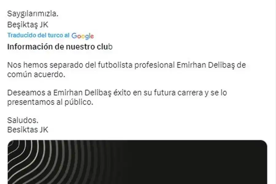 “Nos hemos separado del futbolista profesional Emirhan Deliba de común acuerdo. Deseamos a Emirhan Deliba éxito en su futura carrera y se lo presentamos al público”, señaló el Besiktas en sus redes sociales.