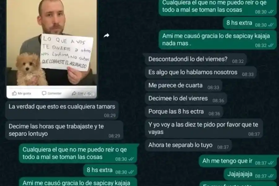 Seguidamente y entre risas, la chica agregó: "Ya quería la ilusa que le paguen el aguinaldo". Para su pesar, su jefe vio la publicación y le envió un mensaje por WhatsApp para comunicarle su decisión.