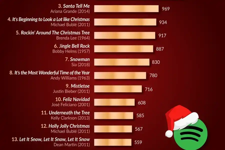 Es el caso de Ariana Grande y su sencillo Santa Tell Me (2014), que acumula unos 960 millones de escuchas en Spotify, o el de Justin Bieber con Mistletoe (2011) que, más de diez años después de su lanzamiento, sigue situándose entre las diez canciones navideñas más escuchadas en la plataforma.