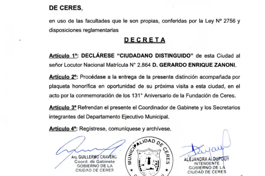 El destacado periodista Gerardo Zanoni, locutor de Radio Rafaela, ha sido galardonado como Ciudadano Distinguido en la ciudad de Ceres, su lugar de origen, en reconocimiento a su trayectoria periodística de más de 45 años.