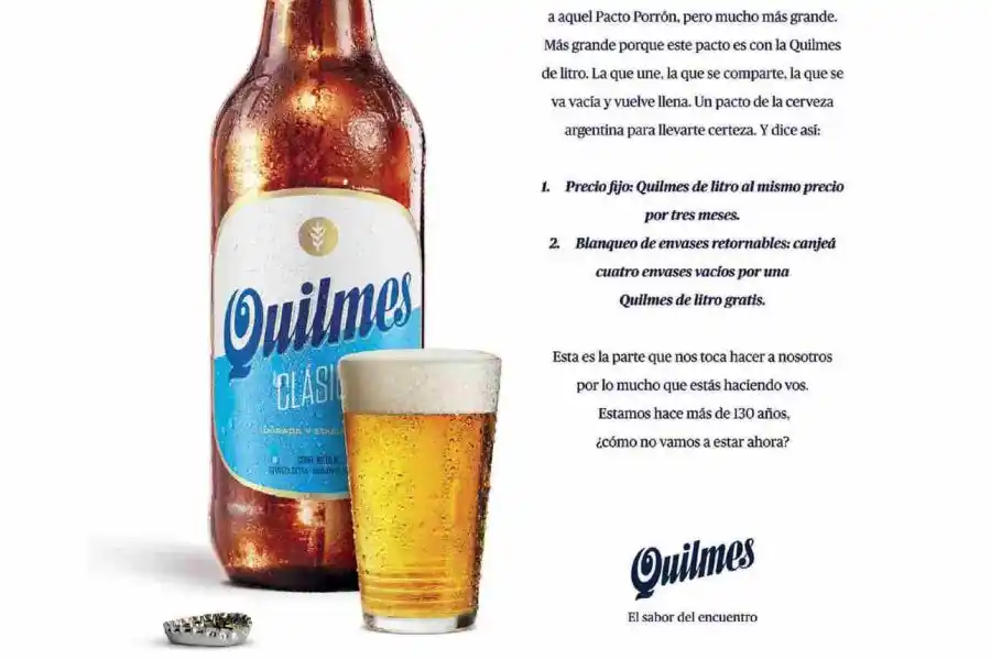 Cerveza Quilmes anunció el lanzamiento del pacto de la cerveza argentina, el Pacto Quilmes: la Quilmes Clásica de litro mantendrá el precio fijo por tres meses y además, los consumidores podrán canjear cuatro envases vacíos por una Quilmes de litro gratis