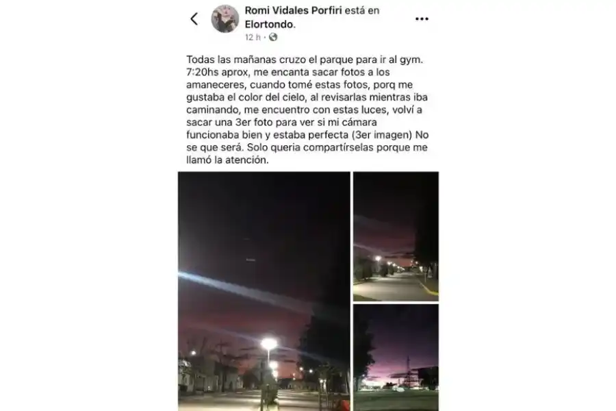En su publicación, que generó comentarios en los medios locales que tomaron la llamativo posteo, la usuaria Romi Vidales Porfiri, detalla que al cruzar “el parque (19 de Marzo) para ir al gym (7:20hs aprox.), me encanta sacar fotos a los amaneceres, cuando tomé estas fotos, porque me gustaba el color del cielo, al revisarlas mientras iba caminando, me encuentro con estas luces, volví a sacar una tercera foto para ver si mi cámara funcionaba bien y estaba perfecta”.