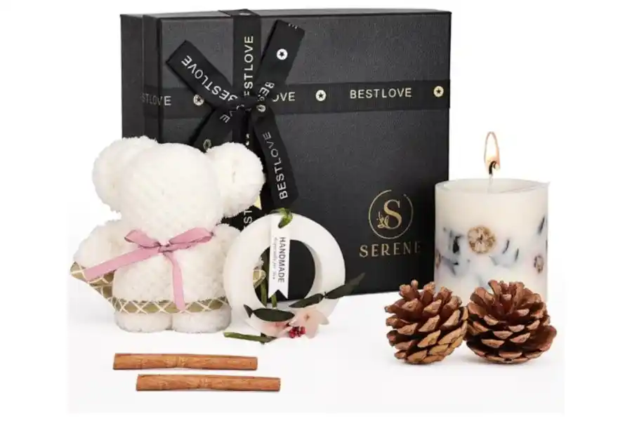 Un regalo perfecto para disfrutar de una atmósfera relajante, ya que incluye una vela aromática de flor de melocotón y miel, un ambientador de armario y una toalla suave y absorbente.