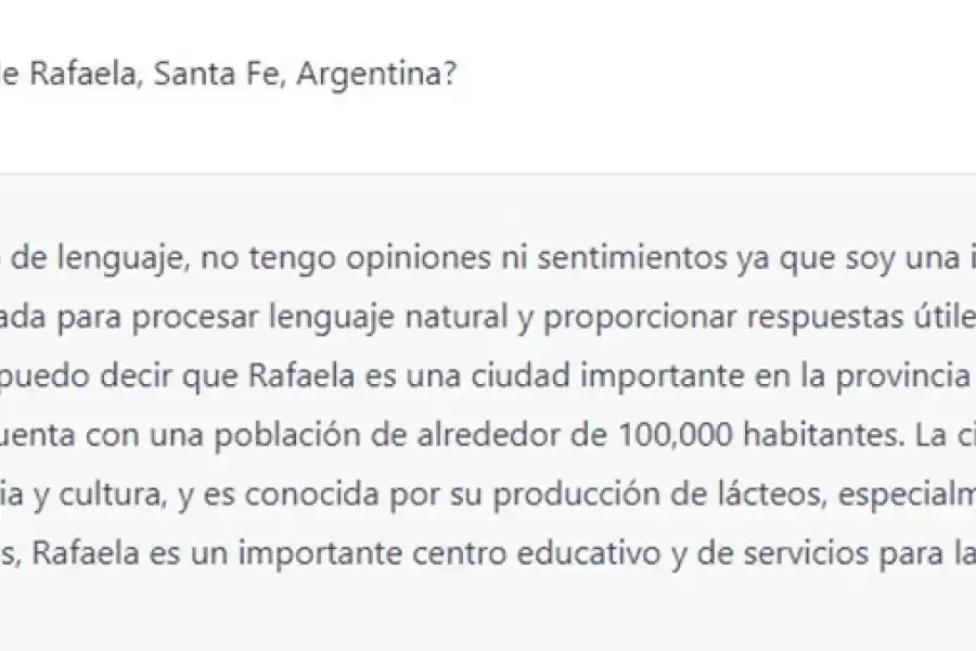 No obstante, punto y seguido a la oración respondió lo interrogado y dijo: “Sin embargo, puedo decir que Rafaela es una ciudad importante en la provincia de Santa Fe, Argentina, y cuenta con una población de alrededor de 100,000 habitantes. La ciudad tiene una rica historia y cultura, y es conocida por su producción de lácteos, especialmente de queso. Además, Rafaela es un importante centro educativo y de servicios para la región”.