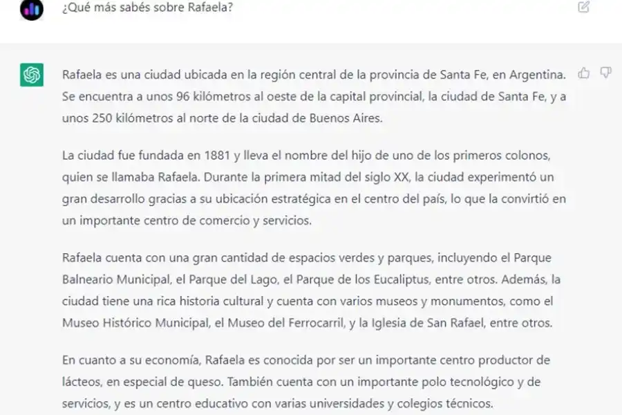 En dos simples preguntas, sin más precisiones sobre que temáticas abordar, la Inteligencia Artificial pudo generar una respuesta certera sobre dónde está Rafaela, cuál fue su origen, qué lugares se pueden visitar, cómo es su economía y la visión educativa.