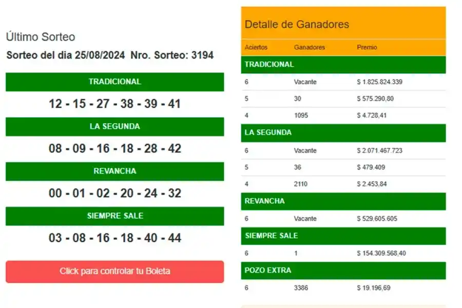 En el Tradicional salieron el 12-39-27-15-38-41. Ningún apostador acertó todos los números y el pozo quedó vacante. Acumula para el próximo sorteo $ 1.825.824.339