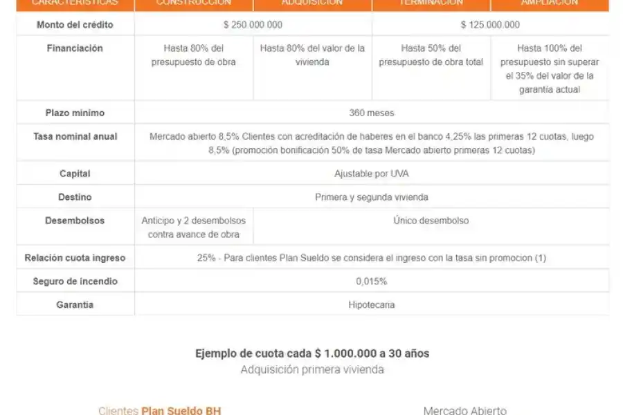 Una se destina a la construcción o adquisición de una vivienda, con una tasa UVA más 4,25% para el primer año, que luego subirá a 8,5%, en el caso de los clientes del Banco Hipotecario que cobran su sueldo en la entidad. Para las otras personas, la tasa será UVAs. La inflación de agosto fue de 7% y la interanual trepó a 78,5% .