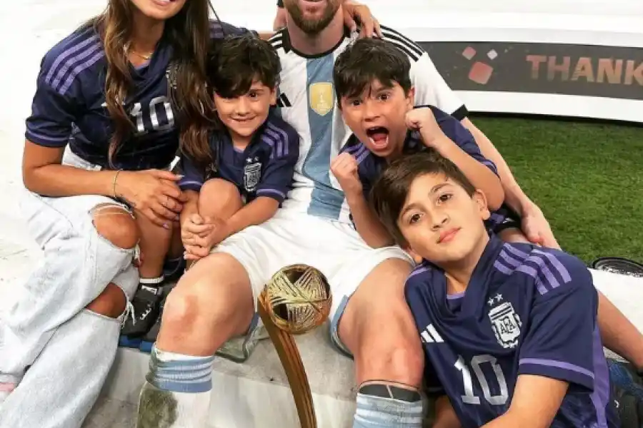 Los jóvenes estuvieron en lo cierto y se trata de una foto captada luego de la consagración de la Selección en el Mundial Qatar 2022. Es una imagen icónica que Messi usó para sus saludos por Año Nuevo. Es una postal luego de vencer por penales a Francia en la histórica final de la que se cumplen nueve meses este lunes: se lo ve a Leo junto a su mujer, Antonela Roccuzzo, y sus tres hijos, Thiago, Ciro y Mateo. Junto a ellos aparece el trofeo al “Mejor jugador del Mundial” y se muestran llenos de felicidad.