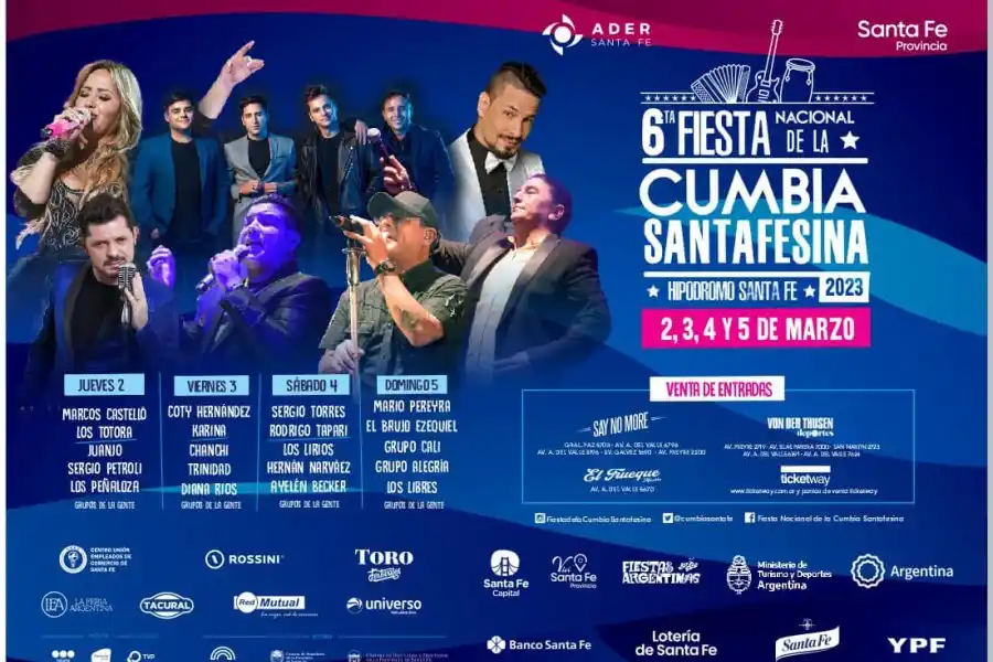 Con una grilla colmada de artistas consagrados santafesinos, como Sergio Torres, Coty Hernández, Juanjo Piedrabuena, Marcos Castelló, Mario Pereyra, Grupo Cali, Alegria, Los Lirios, Exequiel, por nombrar algunos, se suman otros que llegan por primera vez a esta fiesta, como Karina, Los Totora y Rodrigo Tapari, quienes serán los invitados a esta tradicional fiesta de la cumbia santafesina, donde se ensamblaran los distintos estilos para vivir cuatro noches emocionantes.