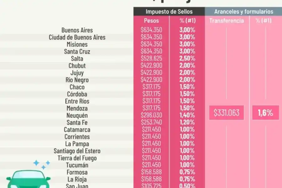 Un estudio publicado por el sitio Argentina en Datos, a través del portal Motor 1, reveló que la Ciudad Autónoma de Buenos Aires (Caba), provincia de Buenos Aires, Misiones y Santa Cruz son las provincias más caras a la hora de transferir un vehículo usado. Santa Fe se encuentra en el puesto 14º de un total de 24 jurisdicciones, y eso se debe a la alícuota correspondiente al impuesto a los sellos que aplicada cada distrito.