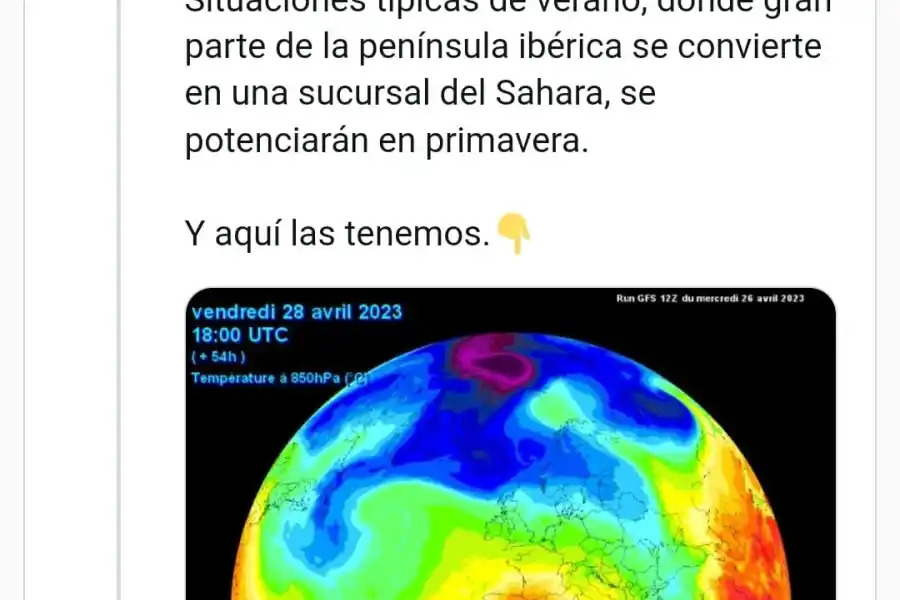 "Situaciones típicas de verano, donde gran parte de la Península Ibérica se convierte en una sucursal del Sáhara, se potenciarán en primavera", prosigue el tuit. Lo acompaña una imagen de la agencia francesa Méteociel, que representa las masas de aire y sus temperaturas para el 26 de abril.