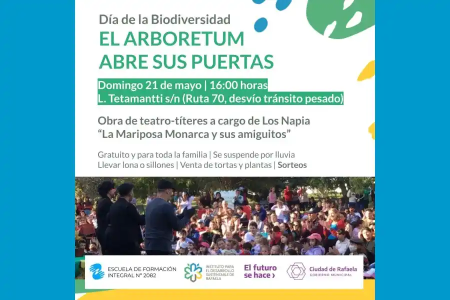 El Instituto para el Desarrollo Sustentable de la Municipalidad de Rafaela, junto a la Escuela de Formación Integral N°2082, realizarán un encuentro en el Arboretum Takku este domingo 21 de mayo a las 16:00. Se trata de un espacio para disfrutar de la naturaleza en familia. Habrá una obra de teatro a cargo de Los Napia y sorteos.
