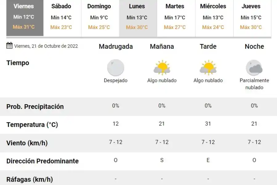 De acuerdo al parte Servicio Meteorológico Nacional, el clima se presentaría sin lluvias, y los vientos del este correrán a una velocidad de entre 13 y 22 kilómetros por hora. La humedad sería del 43 por ciento.