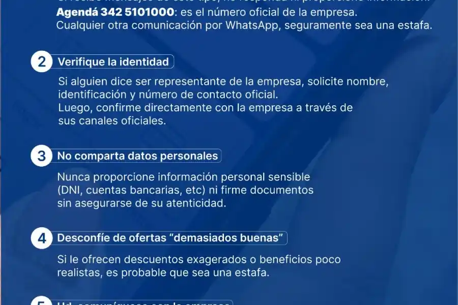 La EPE reiteró que su personal no realiza llamadas personalizadas, y sugirió ante cualquier sospecha no compartir información confidencial, como contraseñas o números de tarjetas, no hacer click en enlaces desconocidos, verificar la información en los canales oficiales de la EPE y agendar el único celular oficial de la Empresa 342-5101000. Ante cualquier duda comunicarse a la policía.