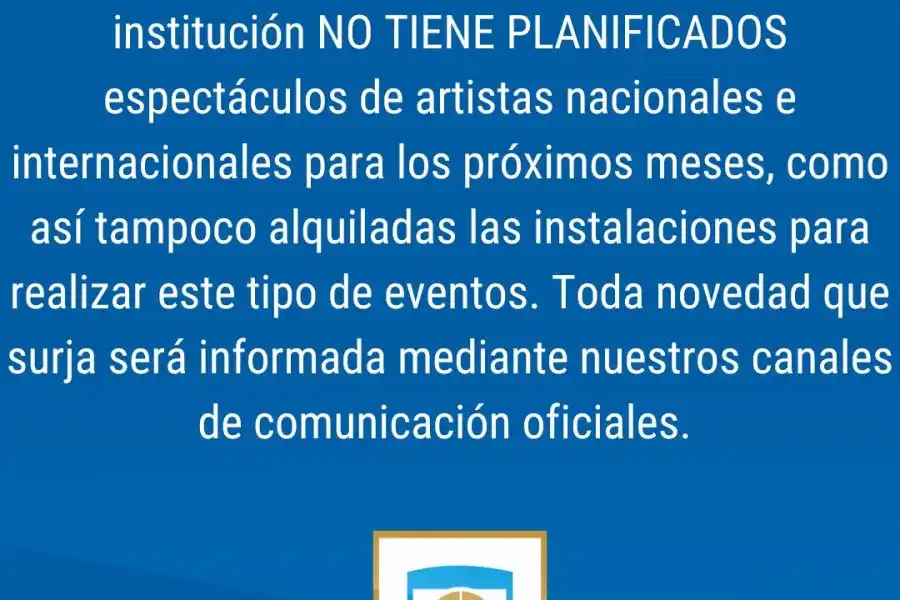 “El Consejo Directivo de Atlético informa que la institución NO TIENE PLANIFICADOS espectáculos de artistas nacionales e internacionales para los próximos meses, como así tampoco alquiladas las instalaciones para realizar este tipo de eventos. Toda novedad que surja será informada mediante nuestros canales de comunicación oficiales”, aclararon.