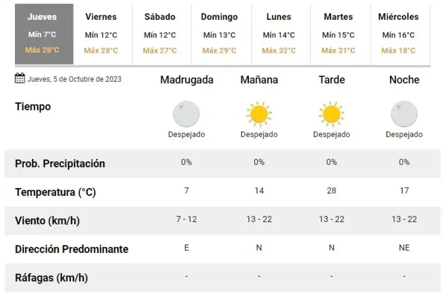 El Servicio Meteorológico Nacional anticipa que este jueves 5 de octubre, la temperatura rondará entre 7 y 28; descartan lluvias durante la jornada en Rafaela.