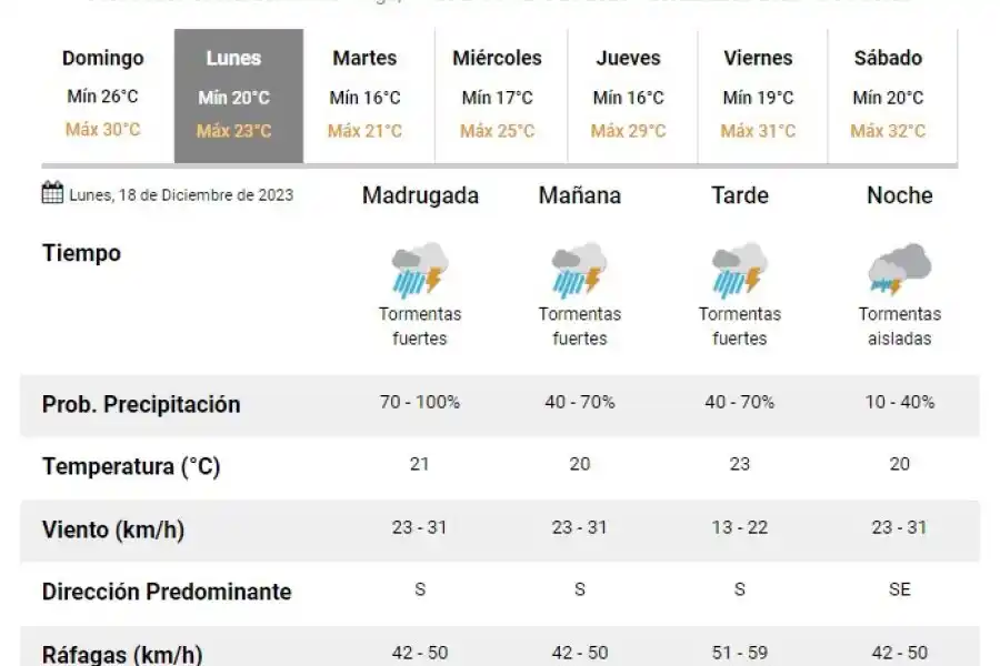 En este sentido, el SMN explicó que “el área será afectada por tormentas, algunas localmente fuertes. Las mismas estarán acompañadas por intensa actividad eléctrica, ocasional caída de granizo, y abundante caída de agua en cortos períodos de tiempo. No se descartan ráfagas fuertes en forma localizada. Se estiman valores de precipitación acumulada entre 40 y 60 mm, pudiendo ser superados en forma puntual”