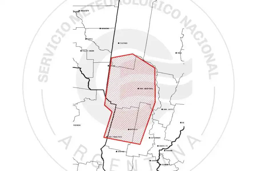 Dicho alerta contempla a los departamentos 9 de Julio, Castellanos, Las Colonias y San Cristóbal, por el lado de Santa Fe; y San Justo en la provincia de Córdoba.