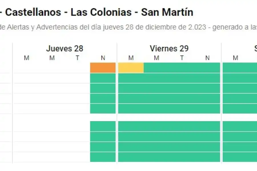Por otro lado, permanece activo un alerta nivel amarillo para la madrugada de este viernes 29 de diciembre. El cual, según indicó el SMN “el área será afectada por tormentas, algunas localmente fuertes. Las mismas estarán acompañadas por ráfagas intensas, fuerte actividad eléctrica, ocasional caída de granizo y abundante caída de agua en cortos períodos. Se estiman valores de precipitación acumulada entre 30 y 80 mm, pudiendo ser superados en forma puntual.”