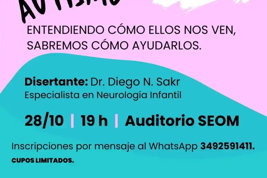 Este viernes 28 de octubre, en el Auditorio del SEOM (Lavalle 1021), se llevará a cabo la charla “Autismo: Entendiendo cómo ellos nos ven, sabremos cómo ayudarlos”. La misma estará a cargo del especialista en neurología infantil, Diego Sakr.