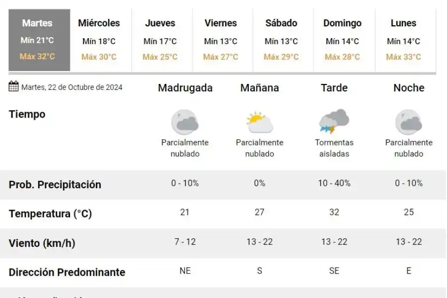 A la noche, el clima rondará los 25 grados, mientras que los vientos serán del noreste a una velocidad de 7 y 12 kilómetros por hora. No se esperan lluvias para esta franja del día.