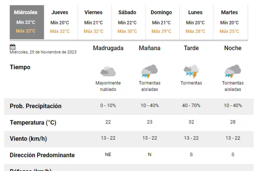 El Servicio Meteorológico Nacional anticipa que este miércoles 29 de noviembre, la temperatura rondará entre 22 y 32; la probabilidad de lluvias alcanzará el 10 y 40 por ciento en Rafaela.