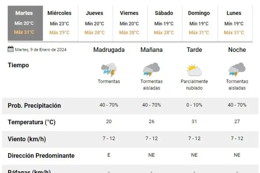 El Servicio Meteorológico Nacional anticipa que este martes 9 de enero, la temperatura rondará entre 20 y 31; la probabilidad de lluvias alcanzará el 40 y 70 por ciento en Rafaela.
