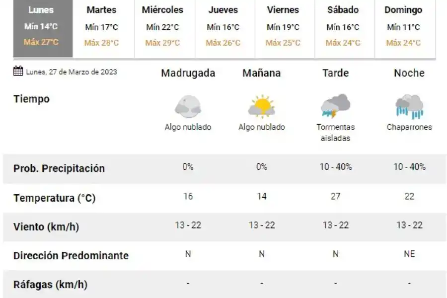 El Servicio Meteorológico Nacional anticipa que este lunes 27 de marzo, la temperatura rondará entre 14 y 27 grados; descartan lluvias durante la jornada en Rafaela