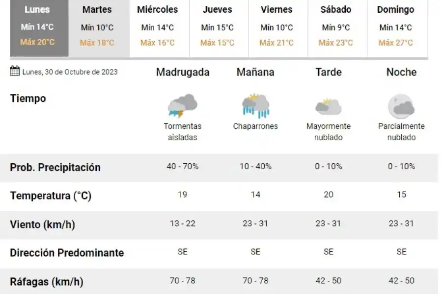 De acuerdo al parte Servicio Meteorológico Nacional, el clima presenta una probabilidad de lluvia de entre 40 y 70 por ciento, y los vientos del sudeste correrán a una velocidad de entre 13 y 22 kilómetros por hora. La humedad sería del 71 por ciento.