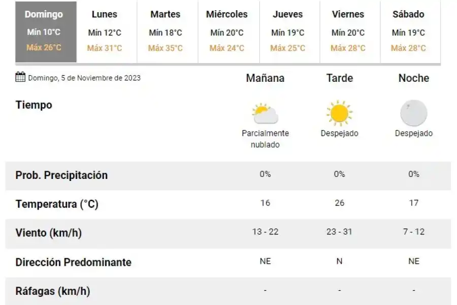 De acuerdo al parte del Servicio Meteorológico Nacional, el clima se presentaría sin lluvias , y los vientos del noreste correrán a una velocidad de entre 13 y 22 kilómetros por hora. La humedad sería del 69 por ciento, y la visibilidad sería buena.