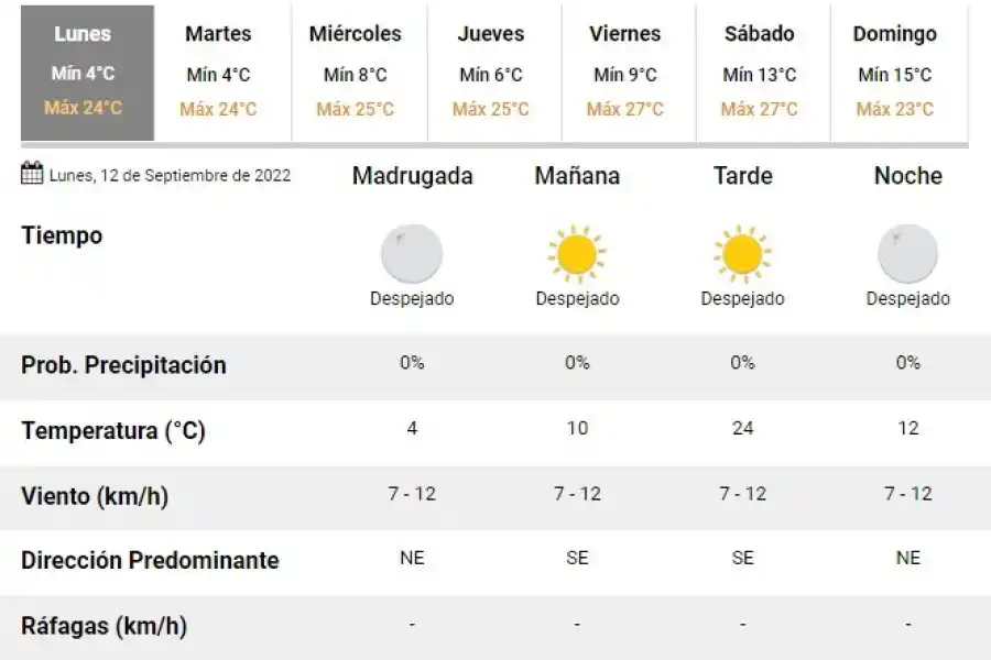 El Servicio Meteorológico Nacional anticipa que este lunes 12 de septiembre, la temperatura rondará entre 6 y 25; descartan lluvias durante la jornada en Rafaela.