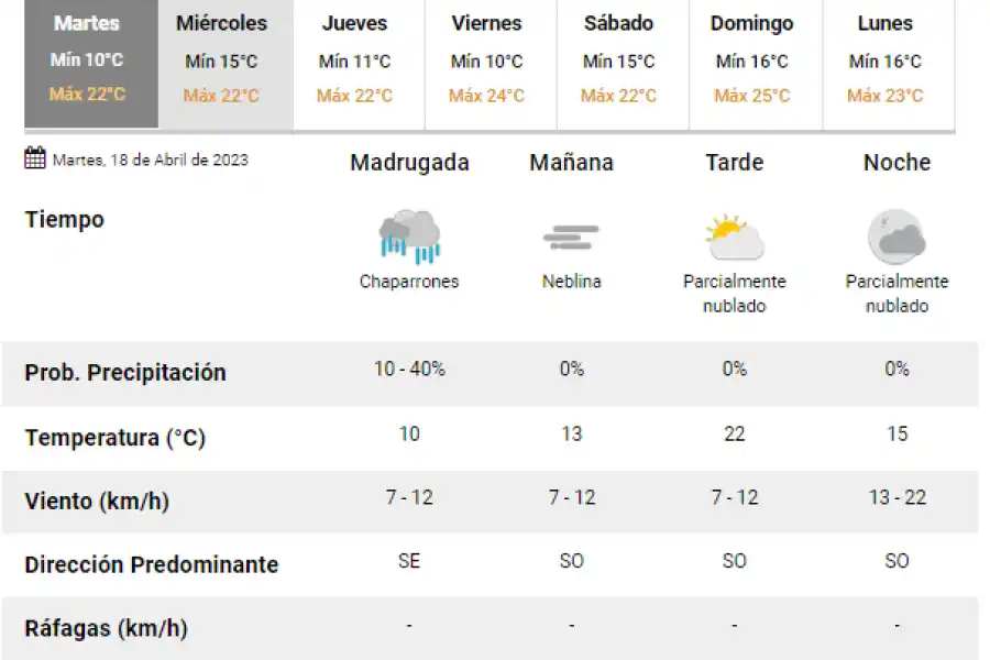El Servicio Meteorológico Nacional anticipa que este martes 18 de abril, la temperatura rondará entre 10 y 25; la probabilidad de lluvias alcanzará el 40 y 70 por ciento en Rafaela