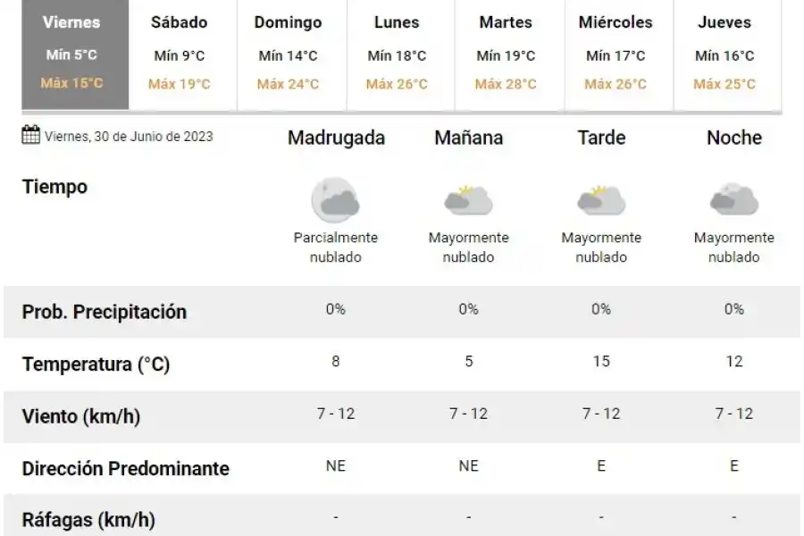 El Servicio Meteorológico Nacional anticipa que este viernes 30 de junio, la temperatura rondará entre 5 y 15; descartan lluvias durante la jornada en Rafaela.