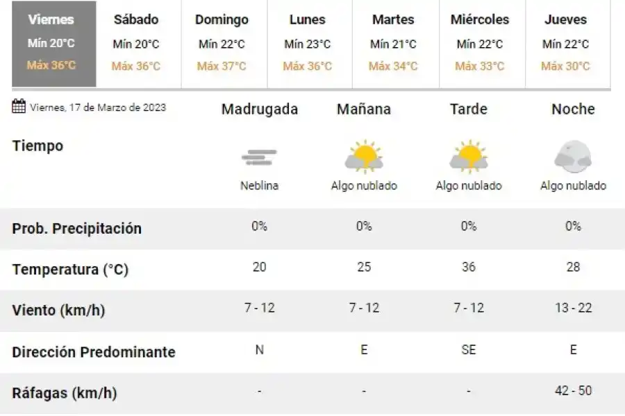 El Servicio Meteorológico Nacional anticipa que este viernes 17 de marzo, la temperatura rondará entre 20 y 36; descartan lluvias durante la jornada en Rafaela.