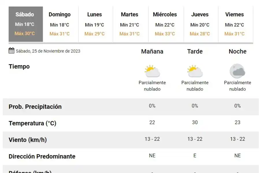 El parte del servicio meteorológico prevé que para después del mediodía el cielo estará algo nublado y los vientos del sector este tendrán velocidades estimadas entre 13 y 22 km/h. La temperatura pronosticada sería de 30 grados.