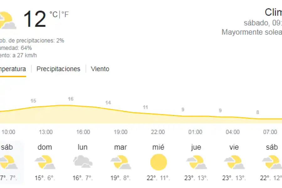 A media mañana, la temperatura actual ronda los 11/12 ºC, con un viento que promedia los 29 km/h proveniente del sector sur-este. Se recomienda abrigo debido a que las ráfagas de viento, durante el día, pueden llegar a los 56 km/h.