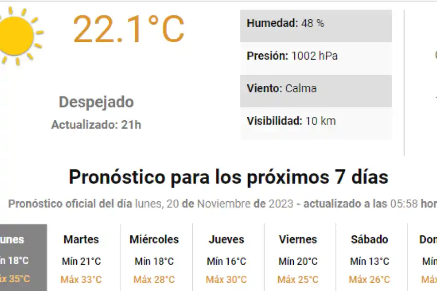 El parte del servicio meteorológico prevé que para después del mediodía el cielo estará mayormente nublado y los vientos del sector noreste tendrán velocidades estimadas entre 13 y 22 km/h. La temperatura pronosticada sería de 35 grados.