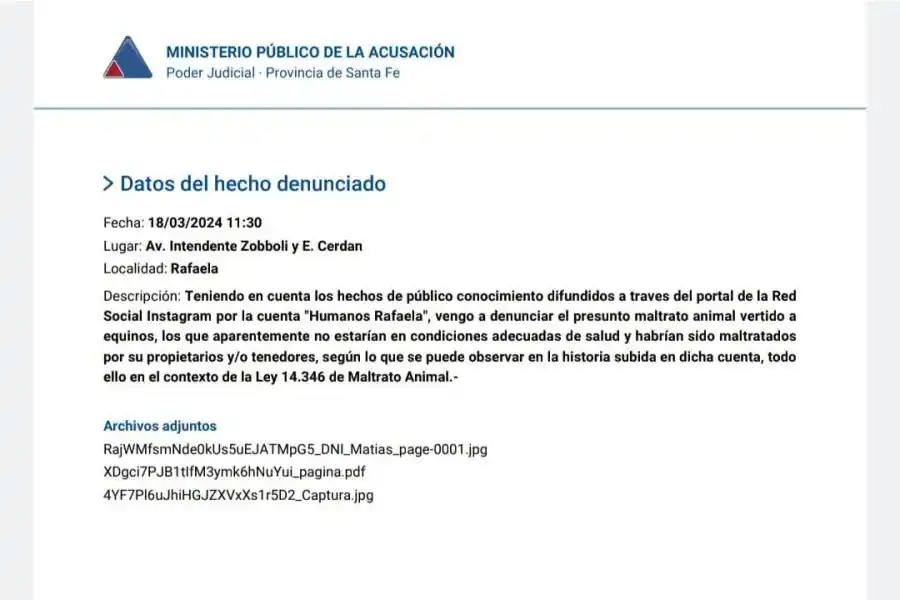 La denuncia fue realizada ante el Ministerio Público de la Acusación por un presunto caso de maltrato animal, tras la difusión de imágenes alarmantes que muestran el sufrimiento de dos caballos utilizados para tirar un carro en condiciones deplorables.